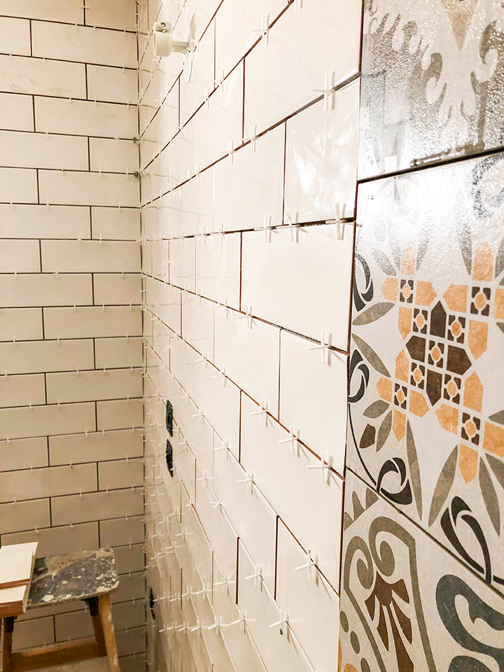 Pose de faïences patchwork décors format 20x20cm, de carrelage imitation bois format 25x150cm et de faïences posées en quinconce format 10x30cm