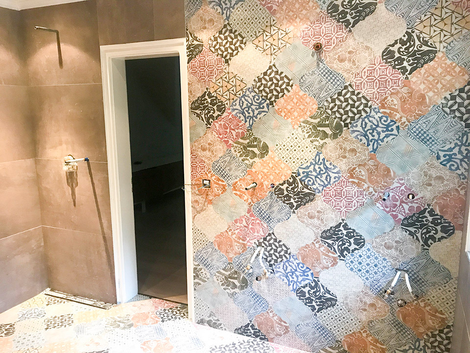 Pose de carrelages à la forme atypique et aux couleurs chaleureuses et de carrelages muraux grès cérame format 60x120cm